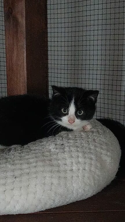 Mistral est un petit mâle noir et blanc de 2 mois et demi mois que nous avons pris en charge suite à un abandon avec ses frères et soeurs.